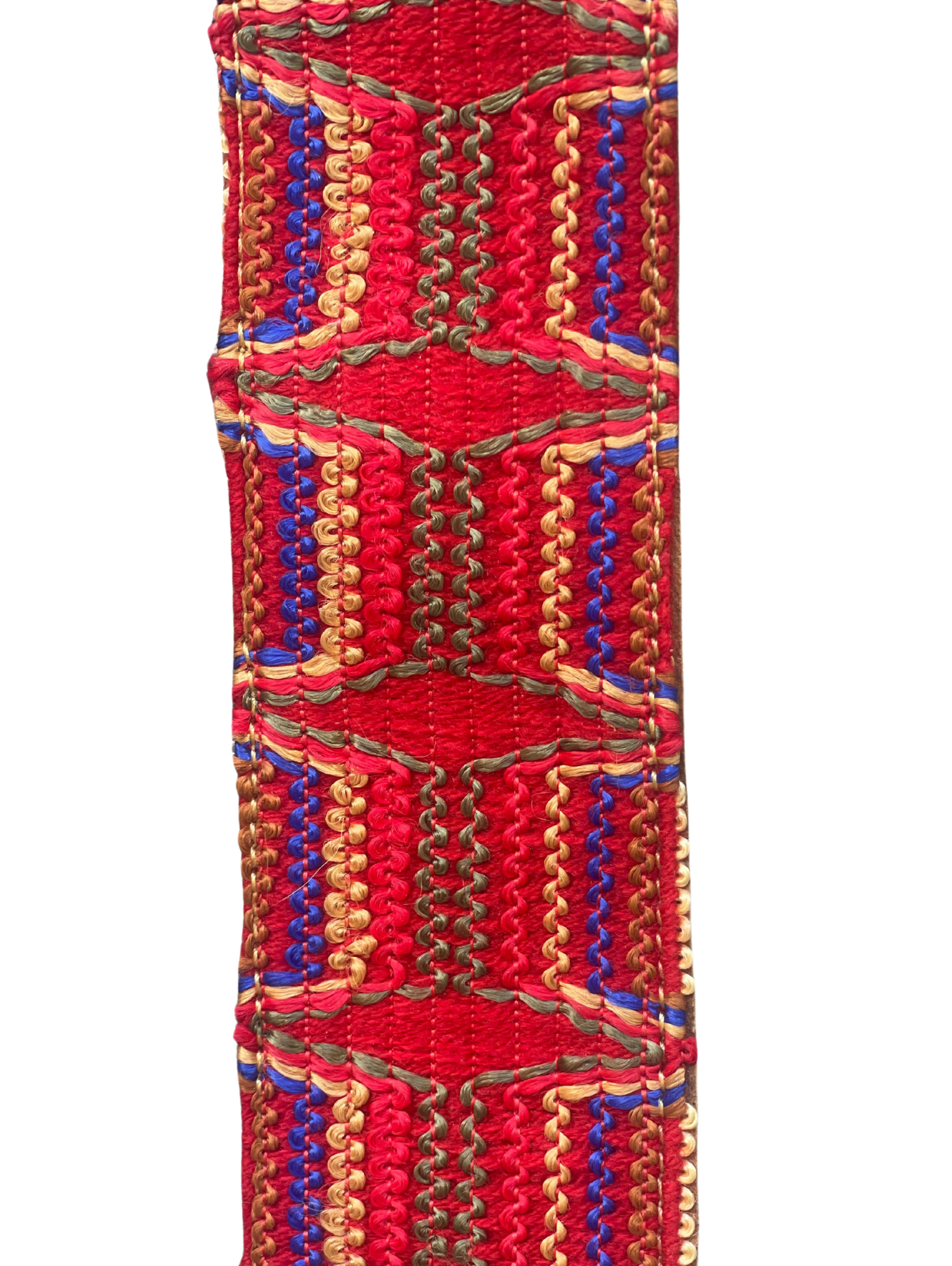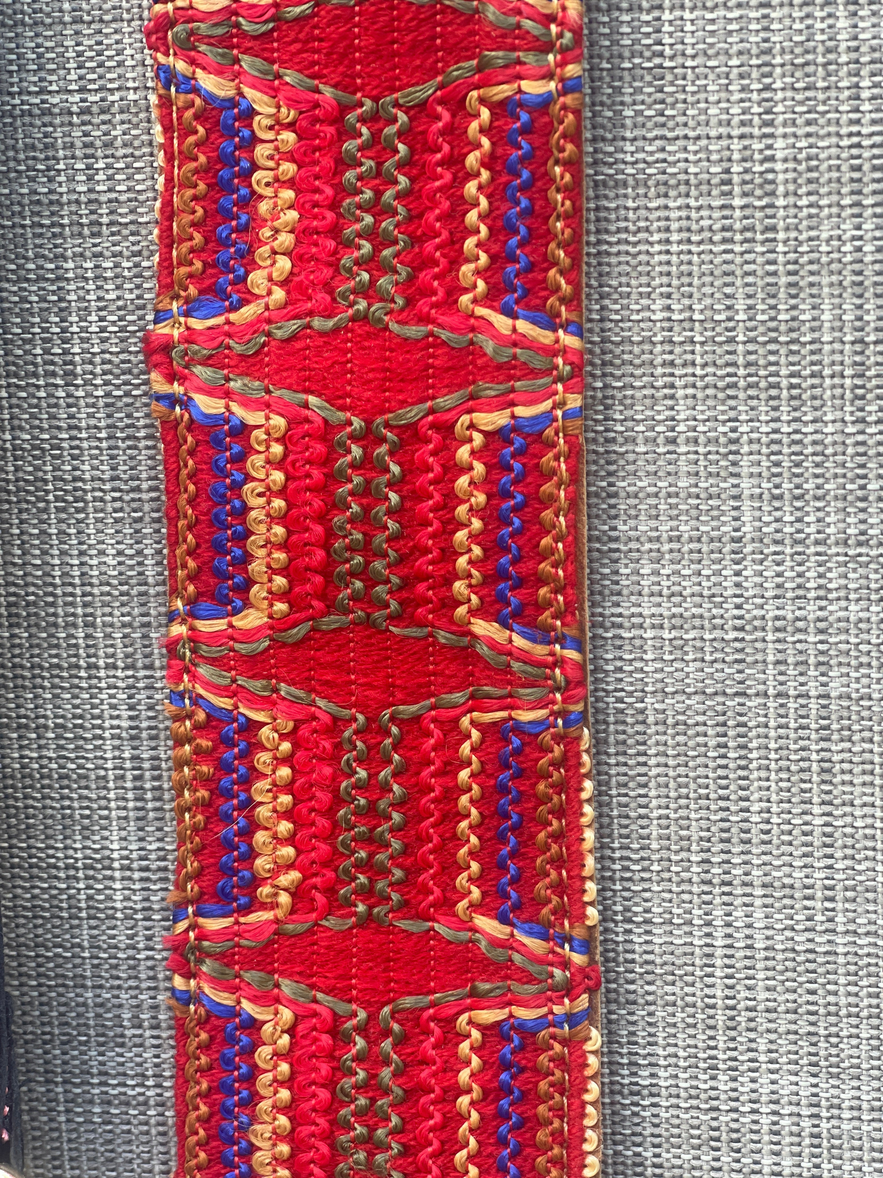 Design : Une broderie artisanale dans des teintes rouge, camel et bleue, apportant une touche de couleur et de modernité à vos accessoires. Large et réglable, elle assure un confort optimal au quotidien.