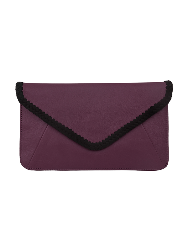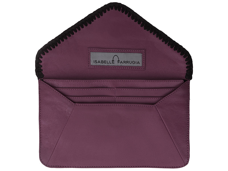 Design : Une pochette ultra-pratique et légère, conçue pour être portée en portefeuille durant la journée ou à la main en soirée, avec un petit rabat triangulaire et des finitions tressées en agneau.
