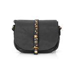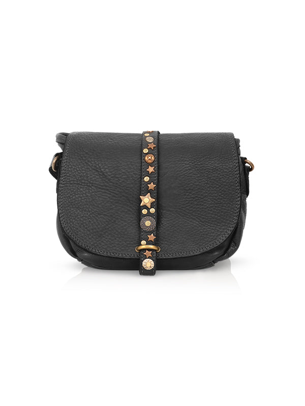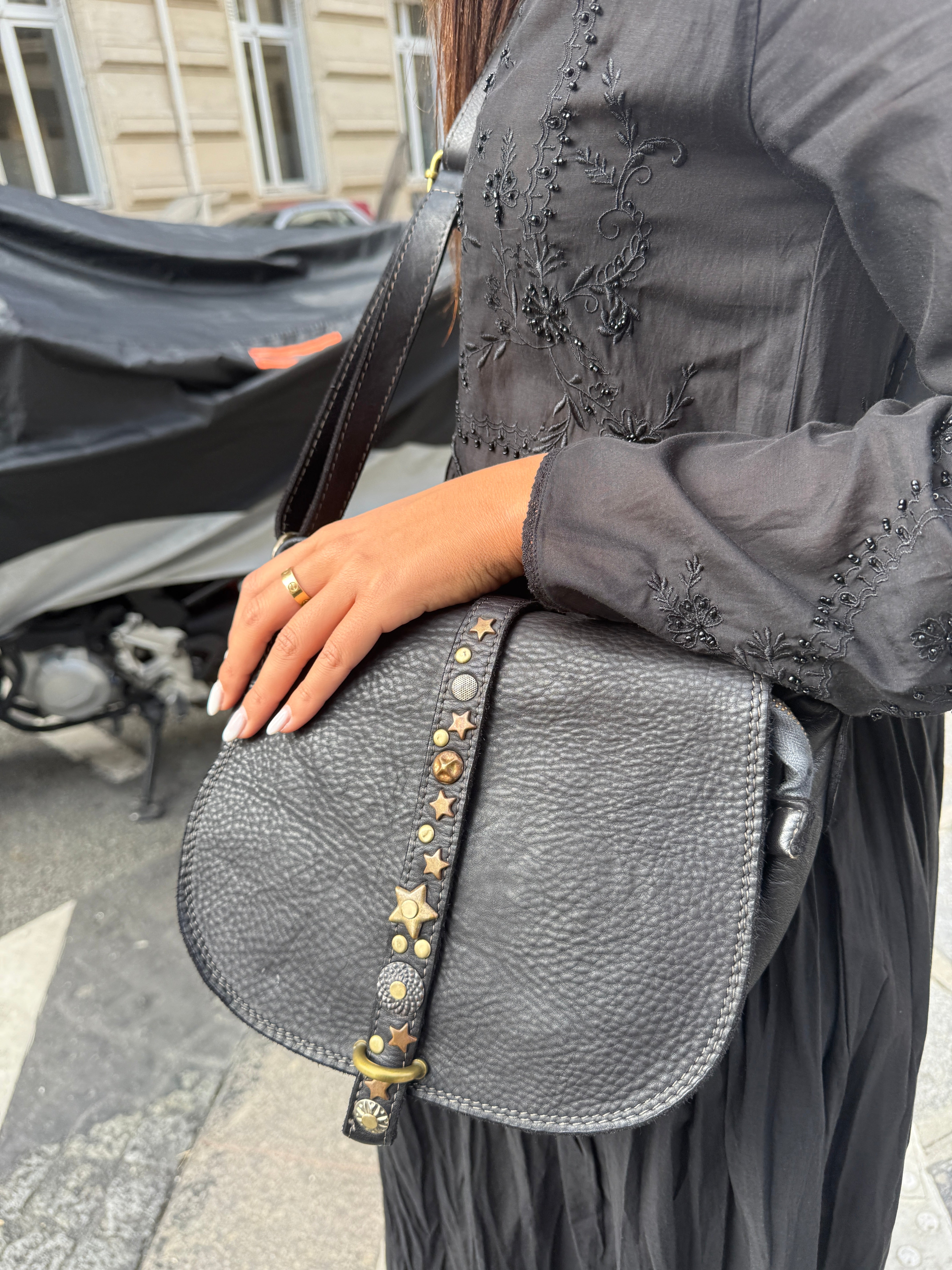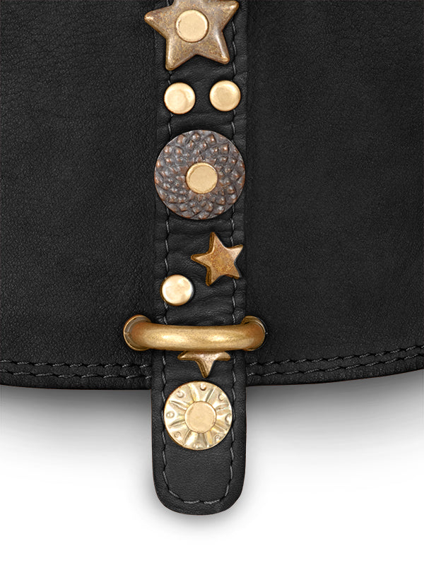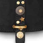 Son rabat est sublimé par une lanière centrale ornée de rivets et d’empiècements en forme d’étoiles et de soleil, pour une touche originale et lumineuse. Chaque détail métallique doré vieilli apporte du caractère à ce sac, tout en restant facile à assortir à vos tenues.
