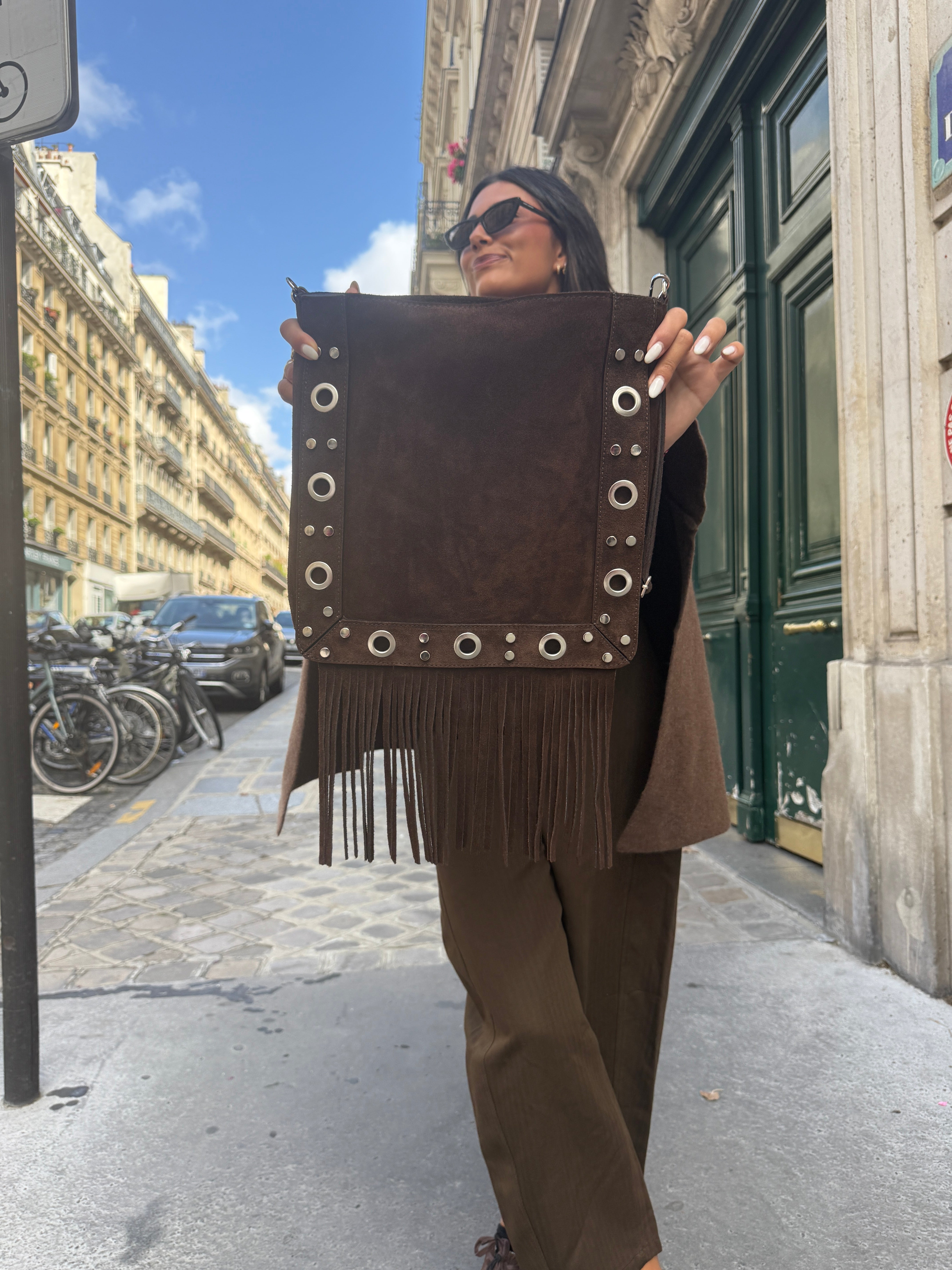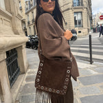 Ses franges souples et ses œillets métalliques argentés lui donnent une allure bohème-rock, idéale pour celles qui veulent un sac pratique mais avec du caractère. Assez spacieux pour accueillir vos essentiels, il se porte aussi bien en journée qu’en soirée.