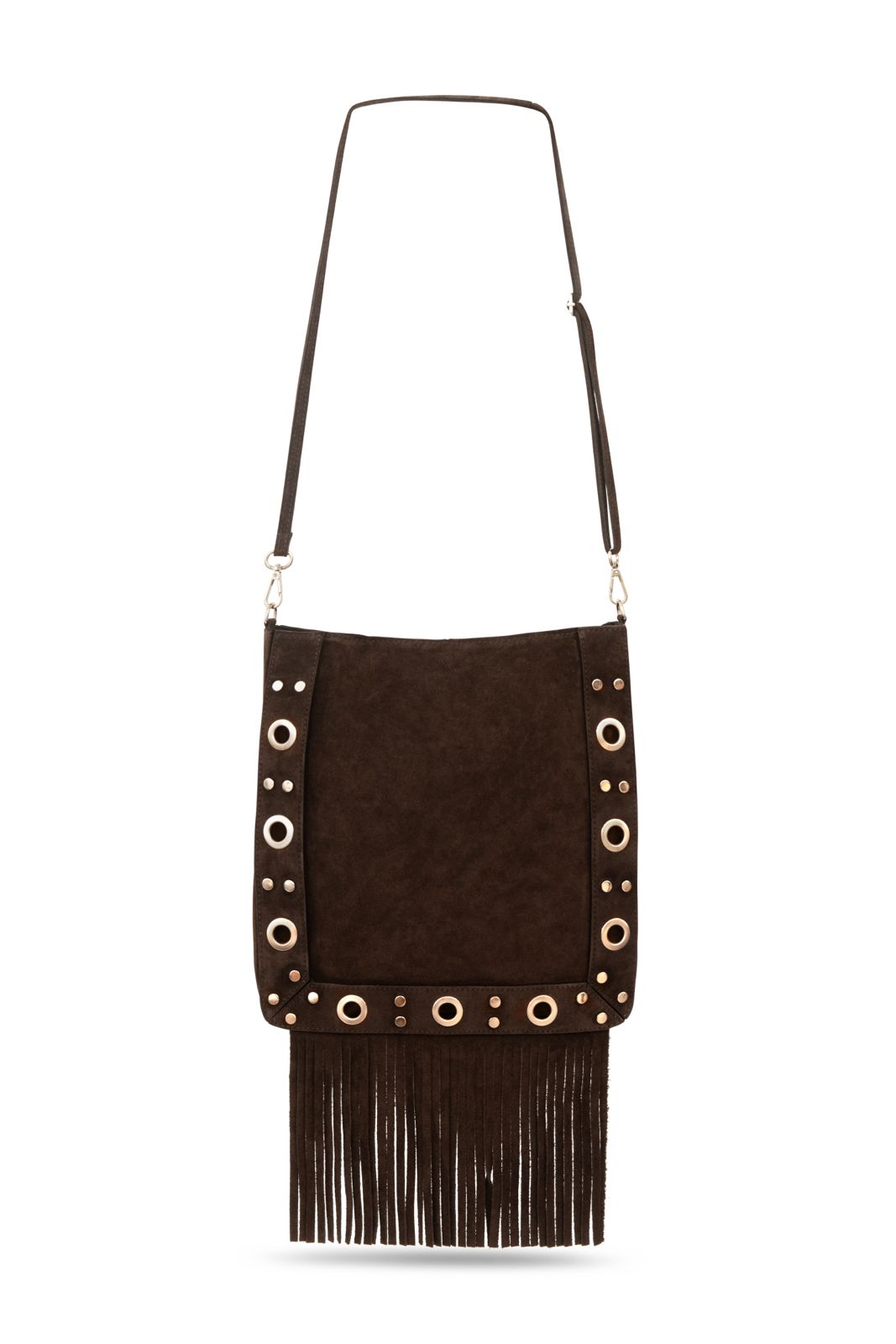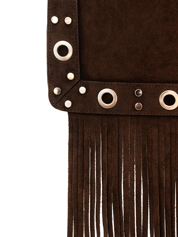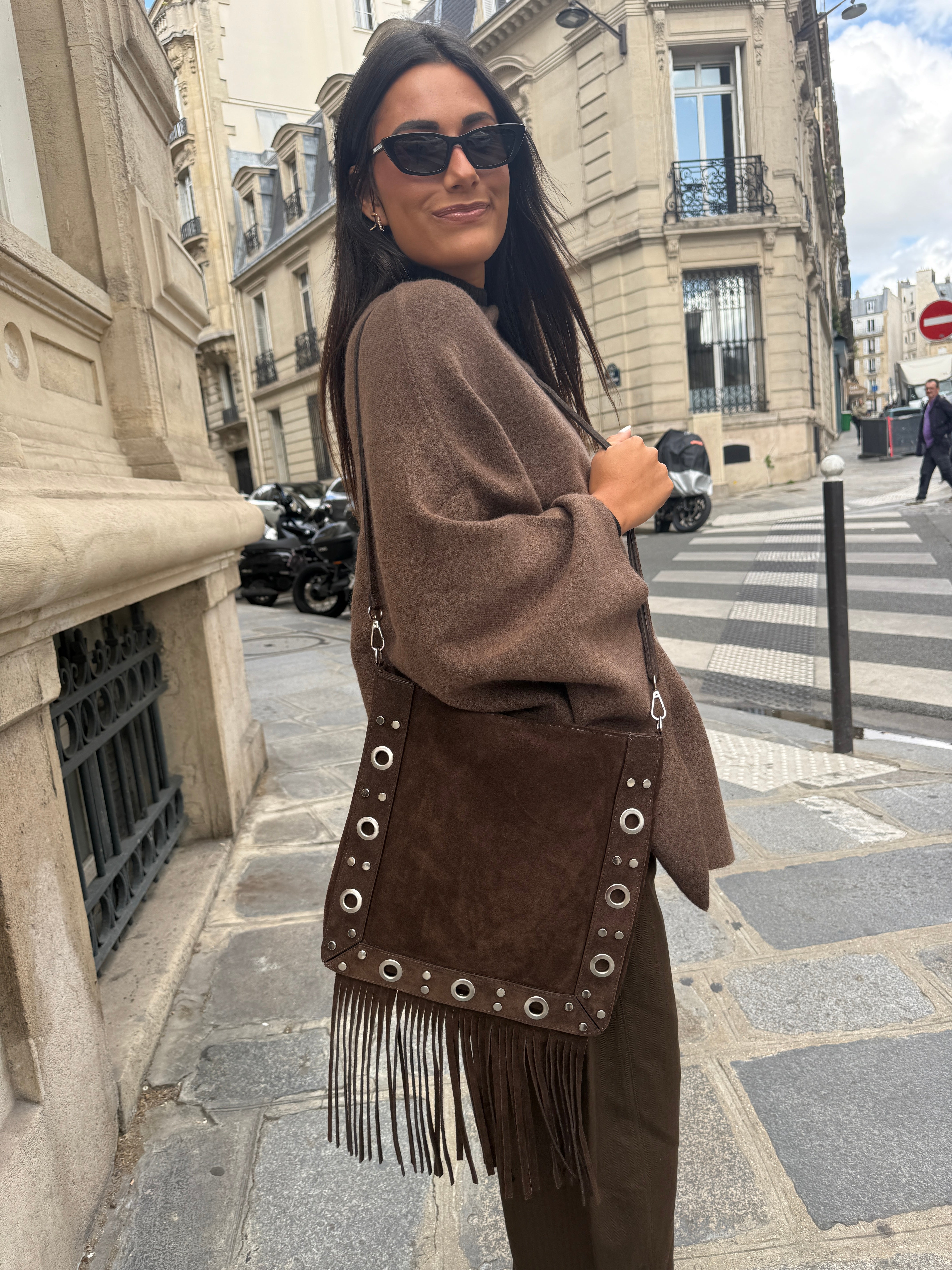 Ses franges souples et ses œillets métalliques argentés lui donnent une allure bohème-rock, idéale pour celles qui veulent un sac pratique mais avec du caractère. Assez spacieux pour accueillir vos essentiels, il se porte aussi bien en journée qu’en soirée.