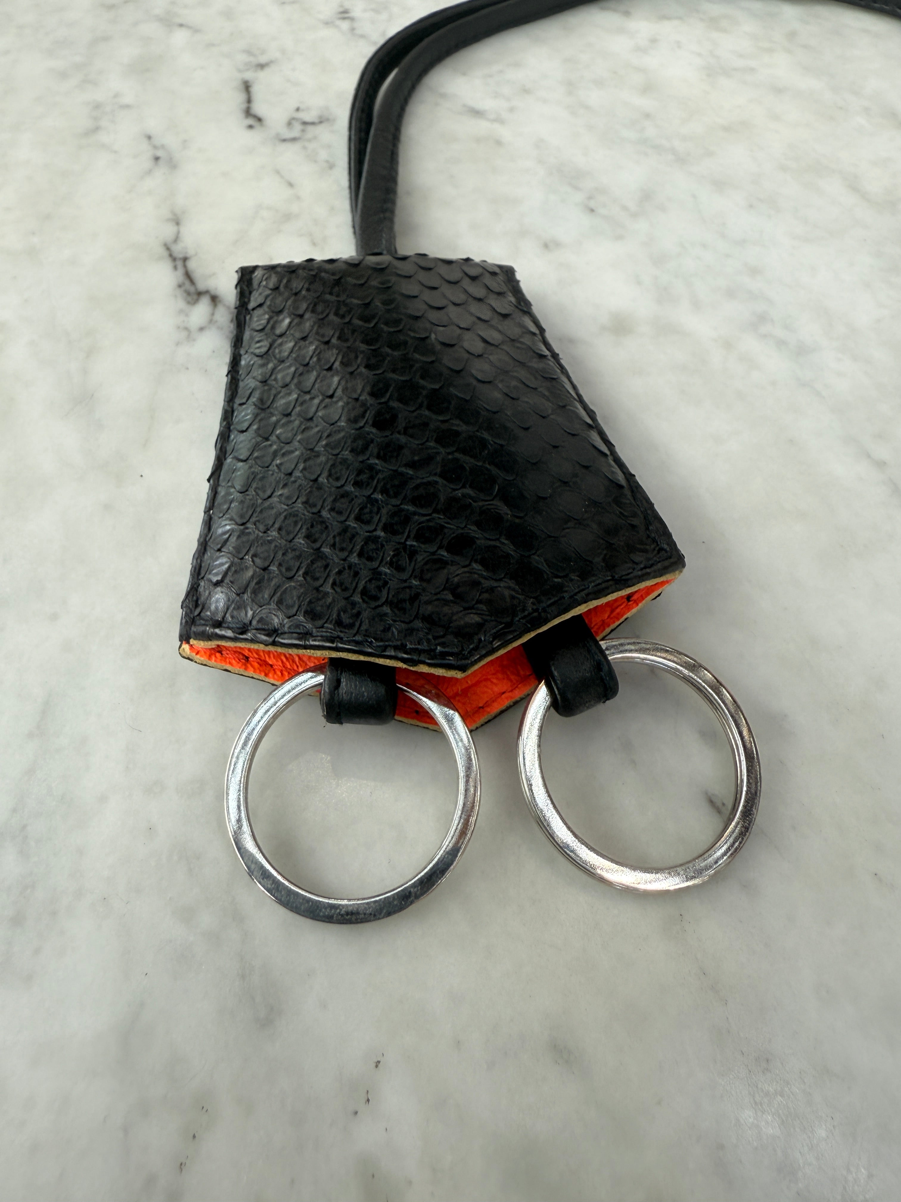 Design : Le porte-clés Sésame allie à la fois chic et praticité. Réalisé en cuir de python véritable, il offre une allure élégante et une fonctionnalité impeccable. Portez-le autour de votre cou pour garder les mains libres ou attachez-le à votre sac pour retrouver vos clés rapidement. Deux anneaux robustes assurent que vos clés sont toujours en sécurité et facilement accessibles.