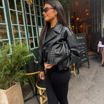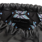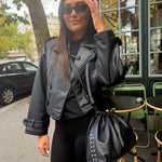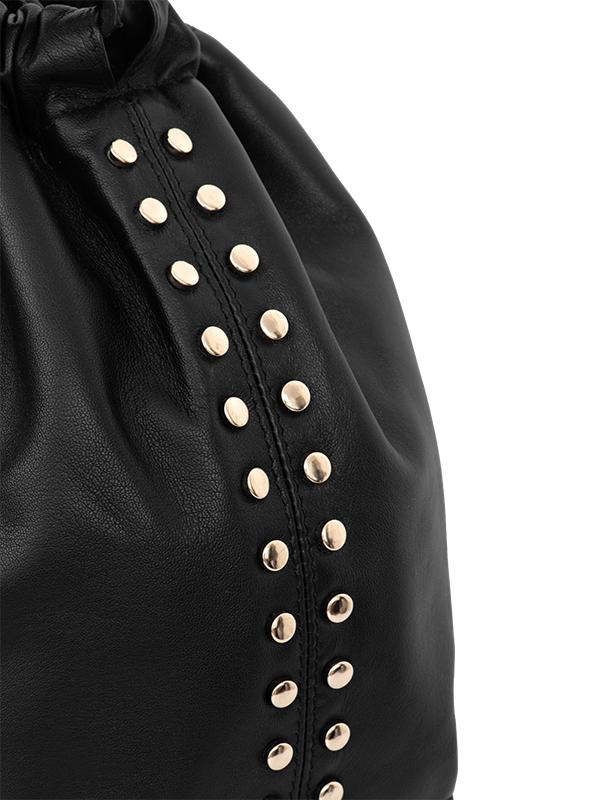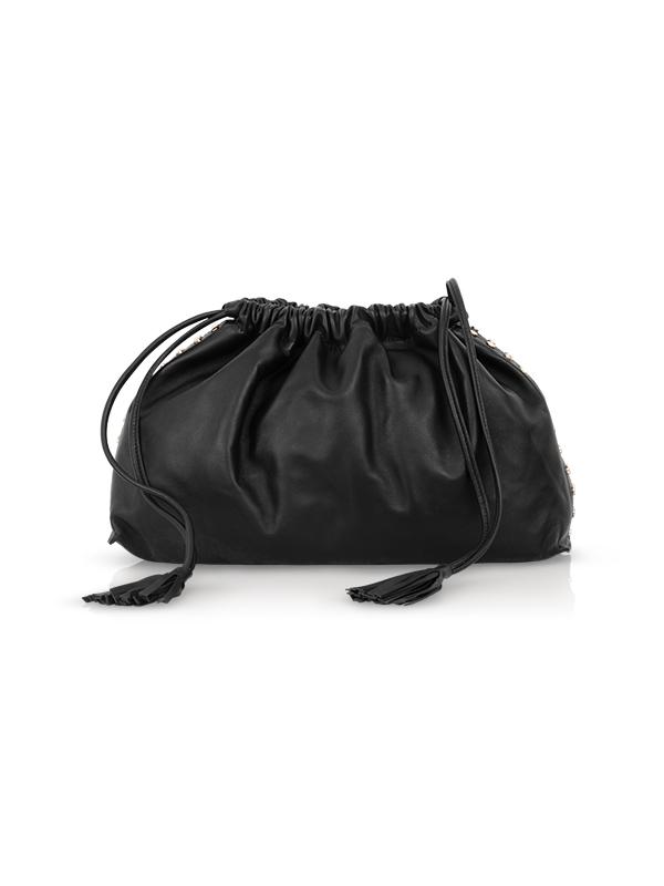 En cuir d'agneau souple noir, il joue avec les contrastes : des plis élégants qui adoucissent, des clous argentés qui affirment, et des pompons sensuels qui se balancent à chacun de vos pas.