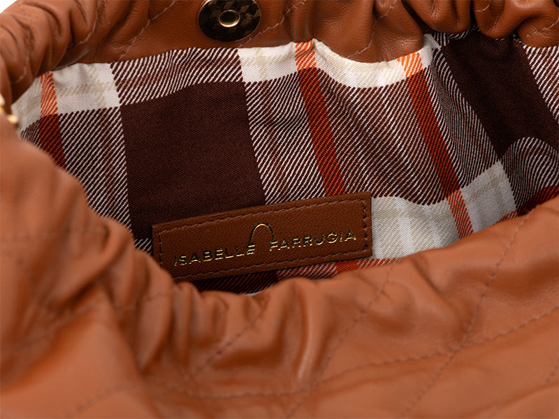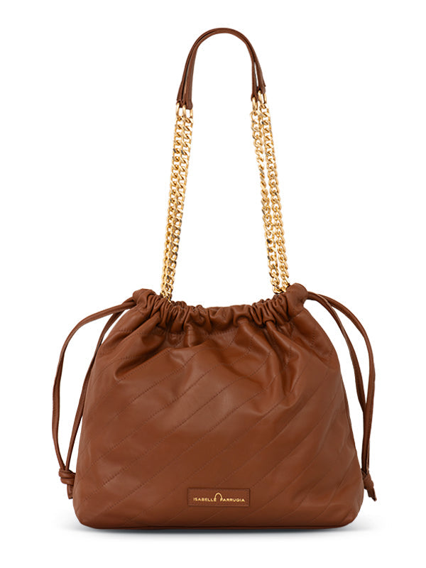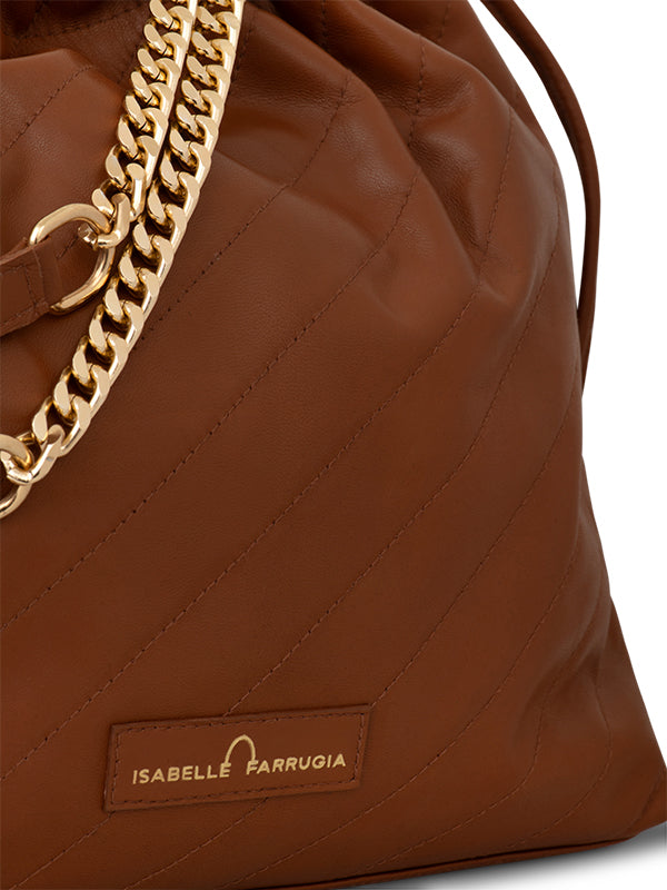 Couleur : Camel, une teinte intemporelle qui se marie facilement avec tous les styles, et une chaîne or rose pour une touche chic et moderne.