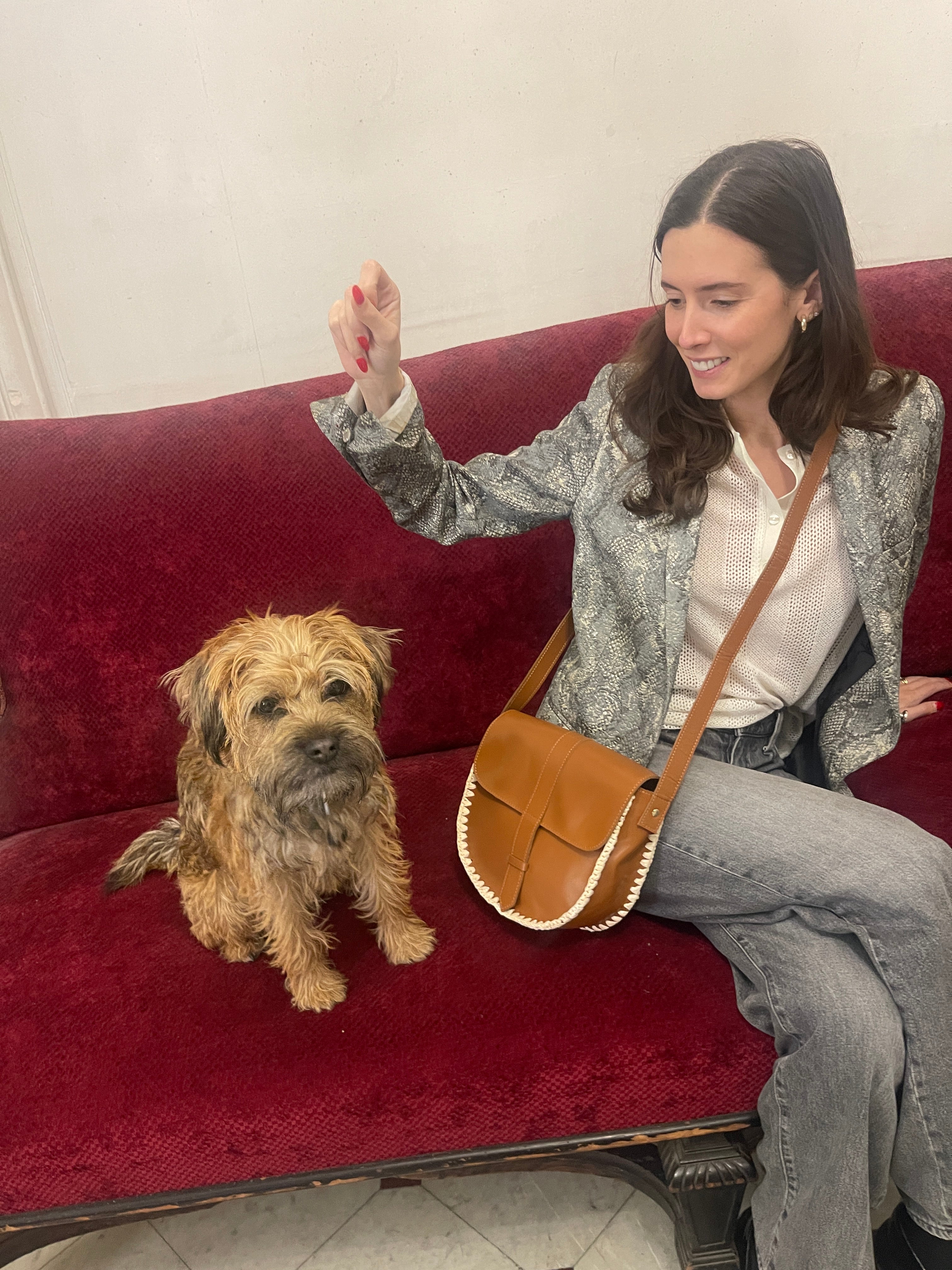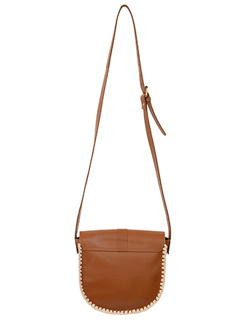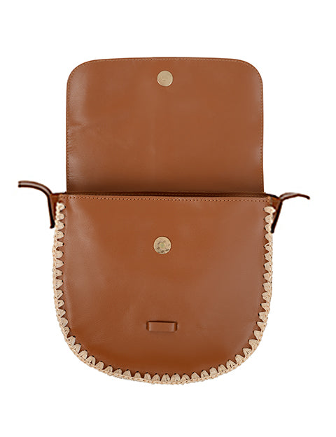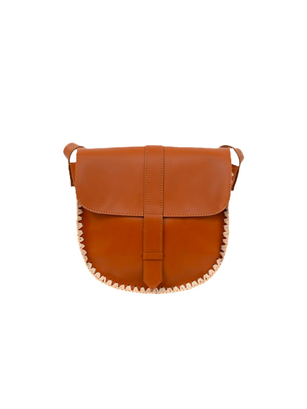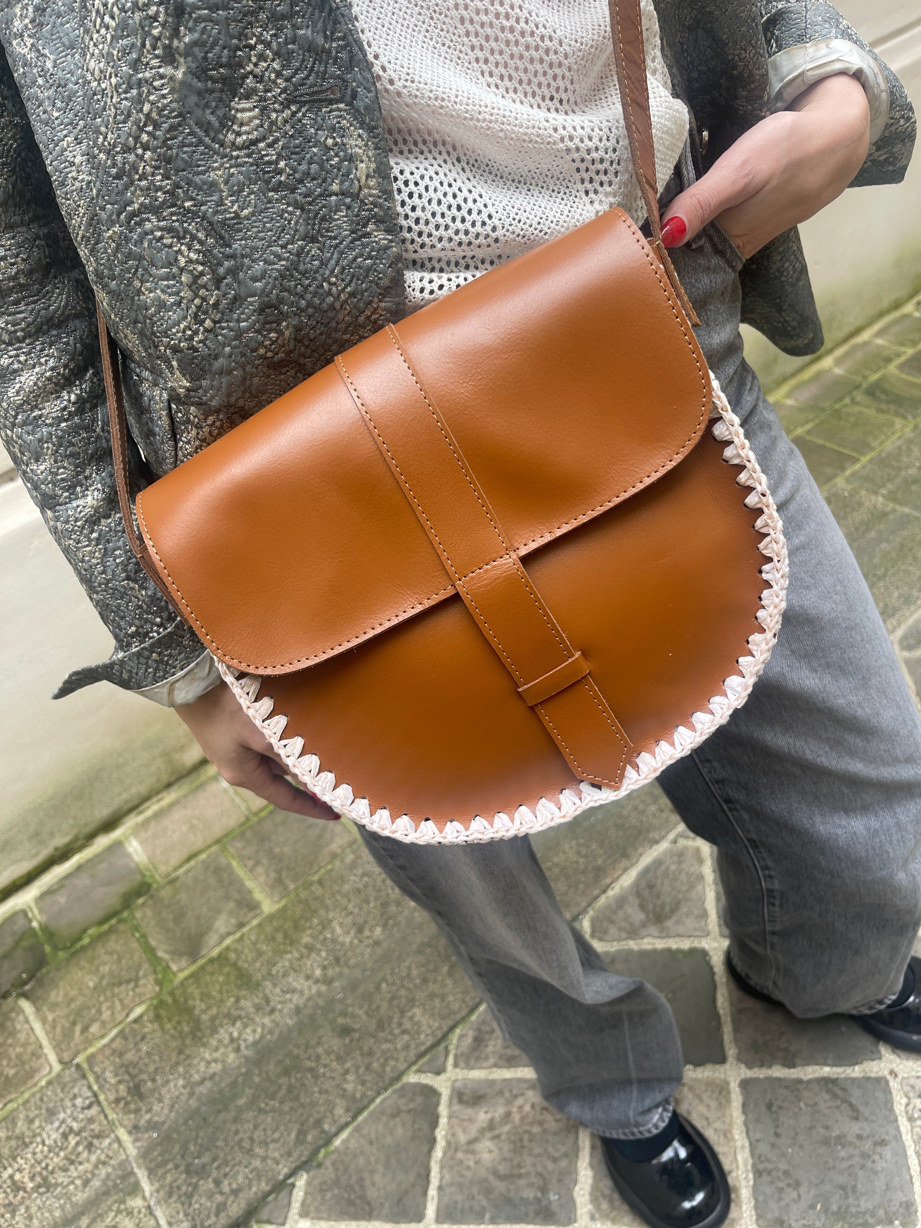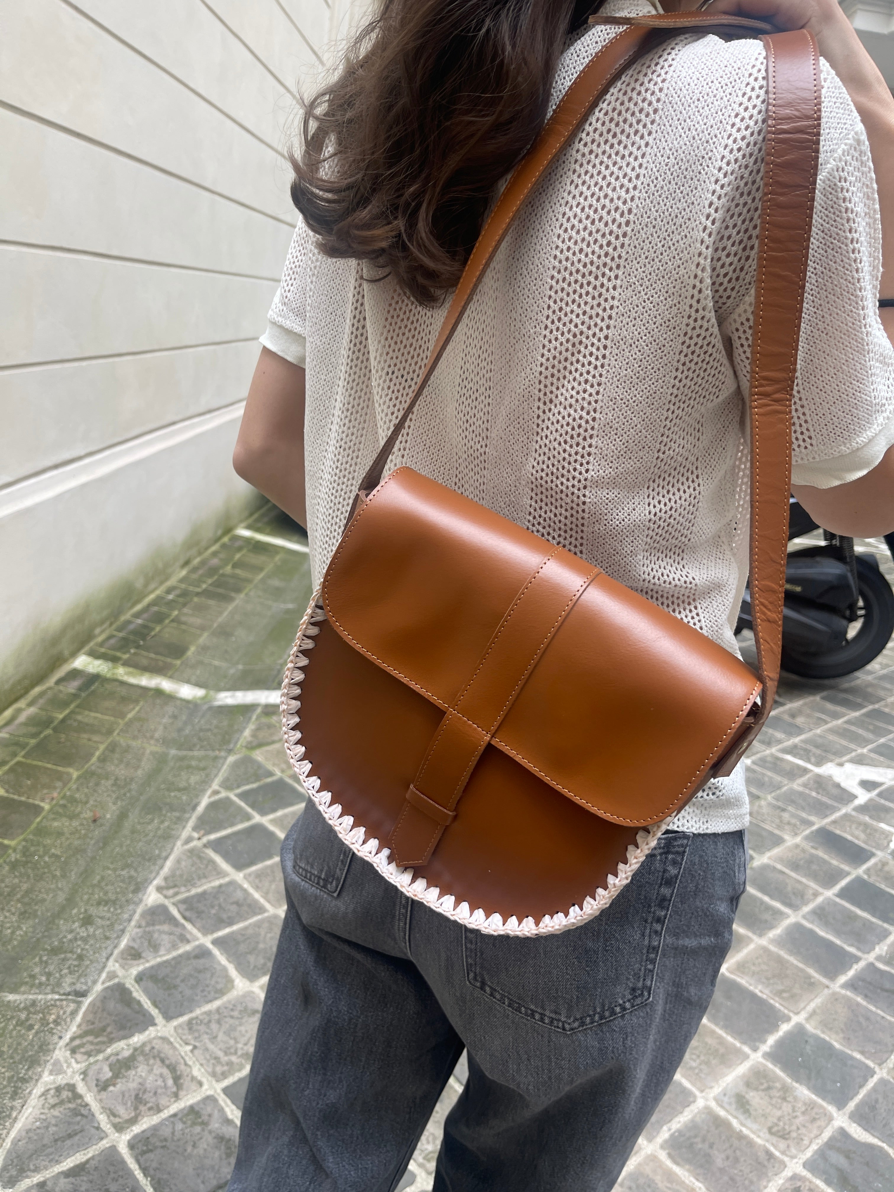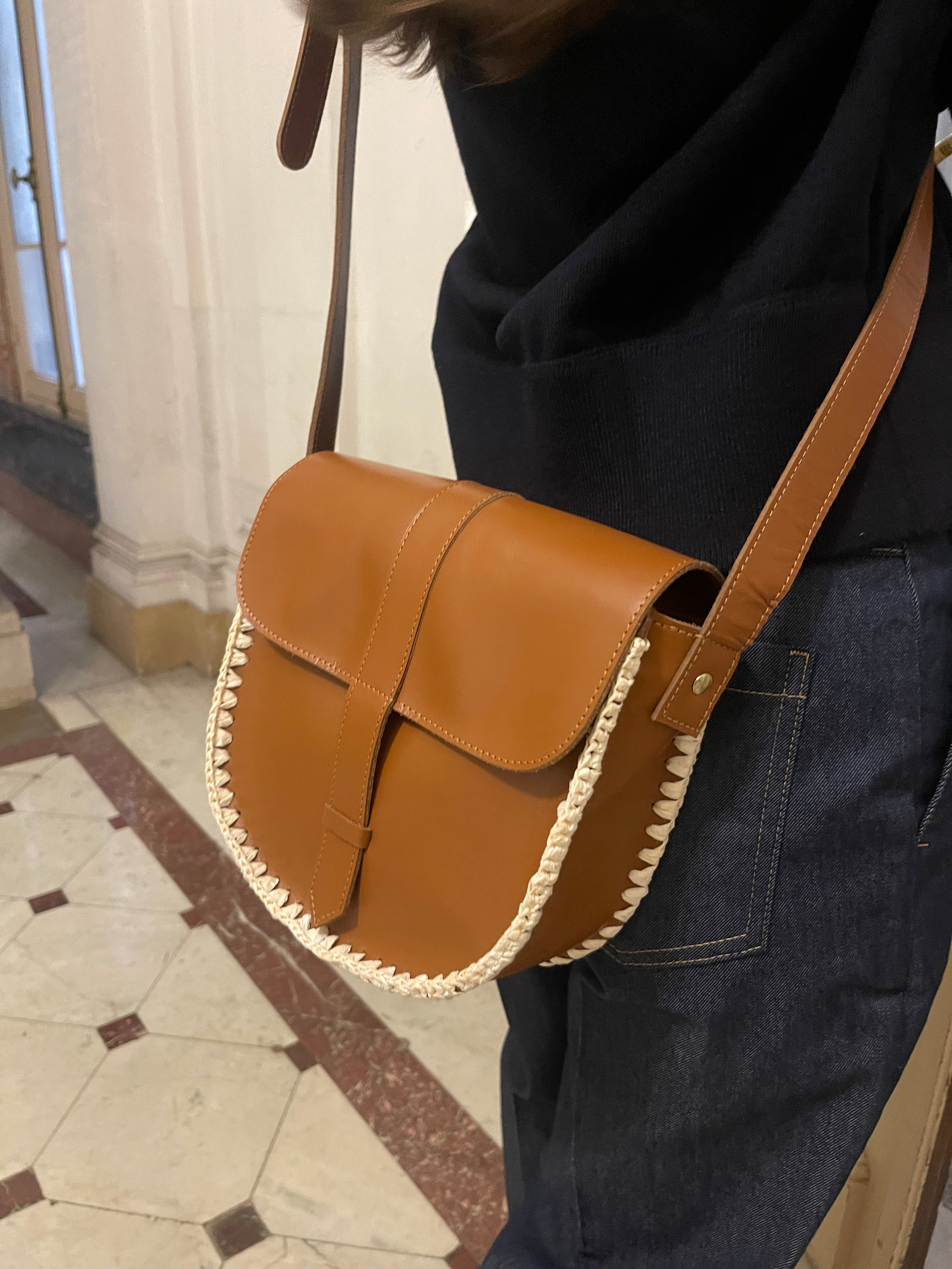 Design : Forme moderne et compacte avec un cuir gold léger et un bord en crochet crème, apportant une touche sophistiquée à votre look.