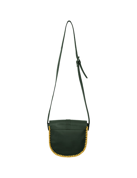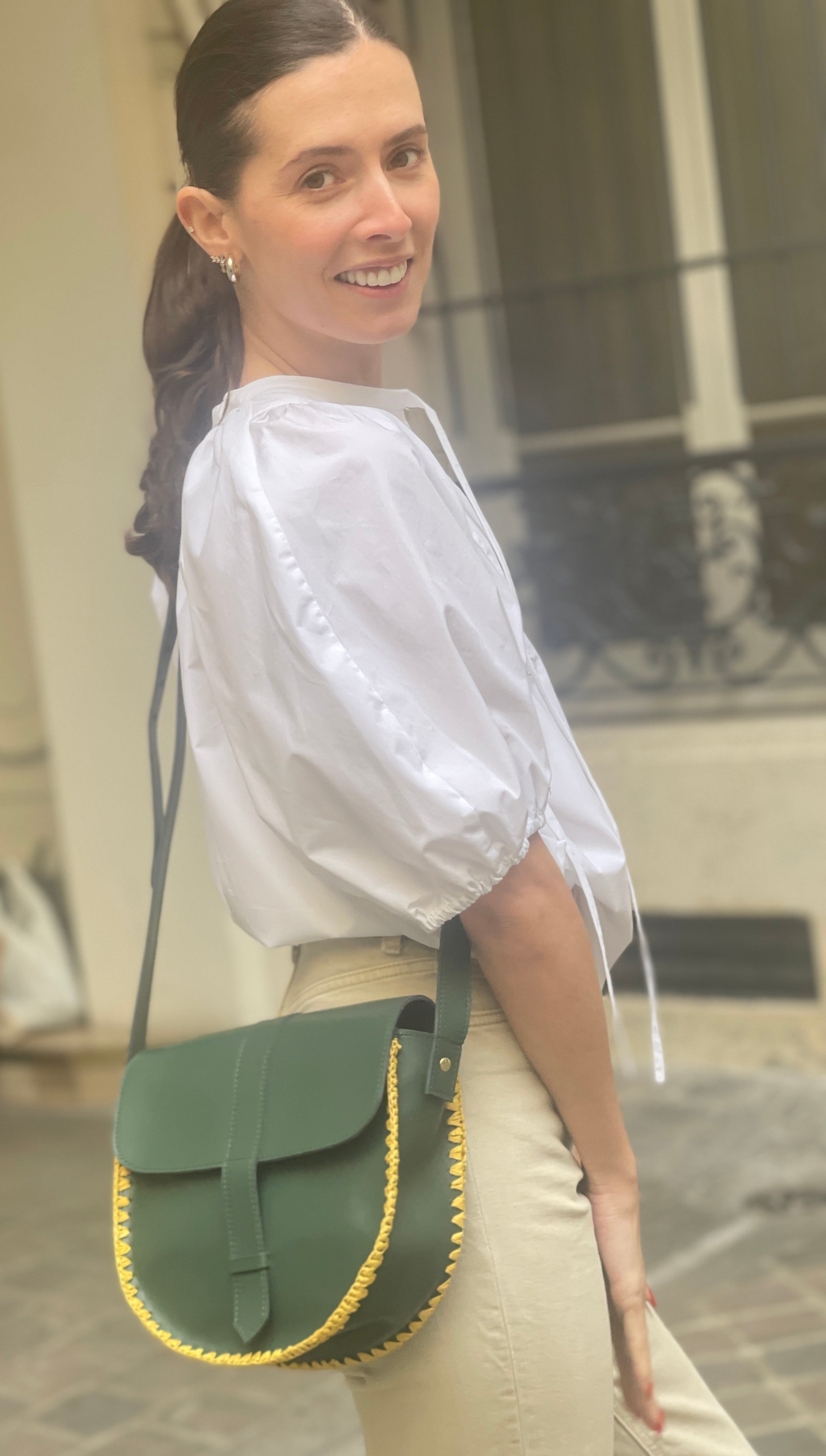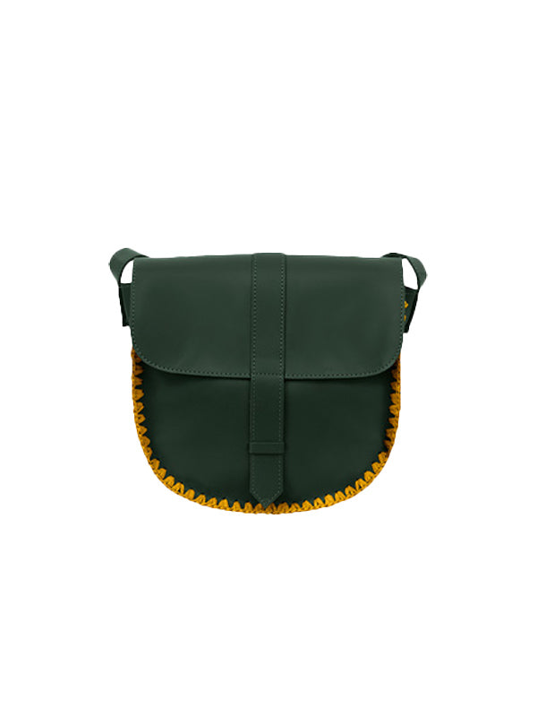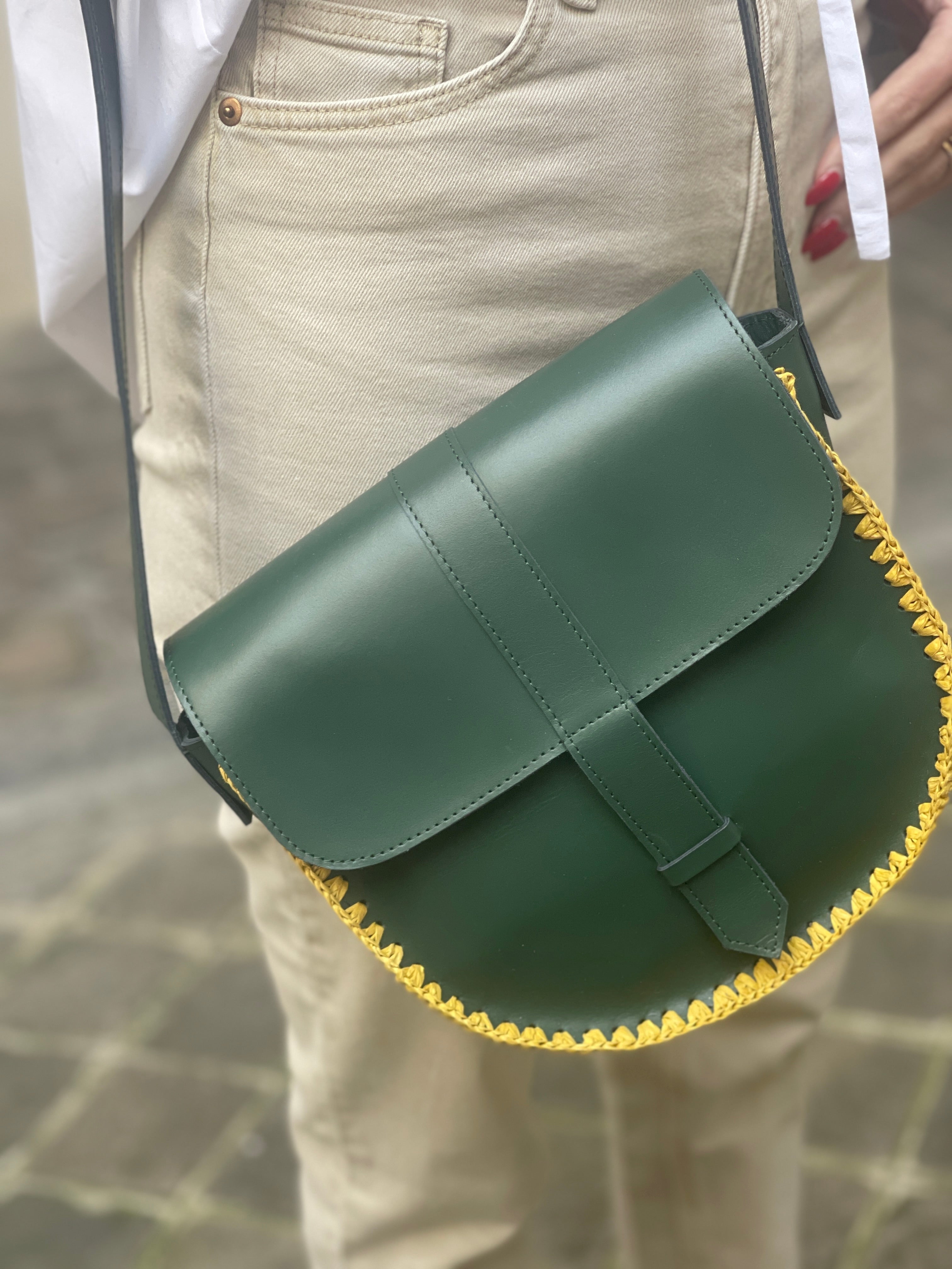 Design : Forme moderne et compacte avec un cuir kaki léger et un bord en crochet moutarde, apportant une touche de couleur et de sophistication.