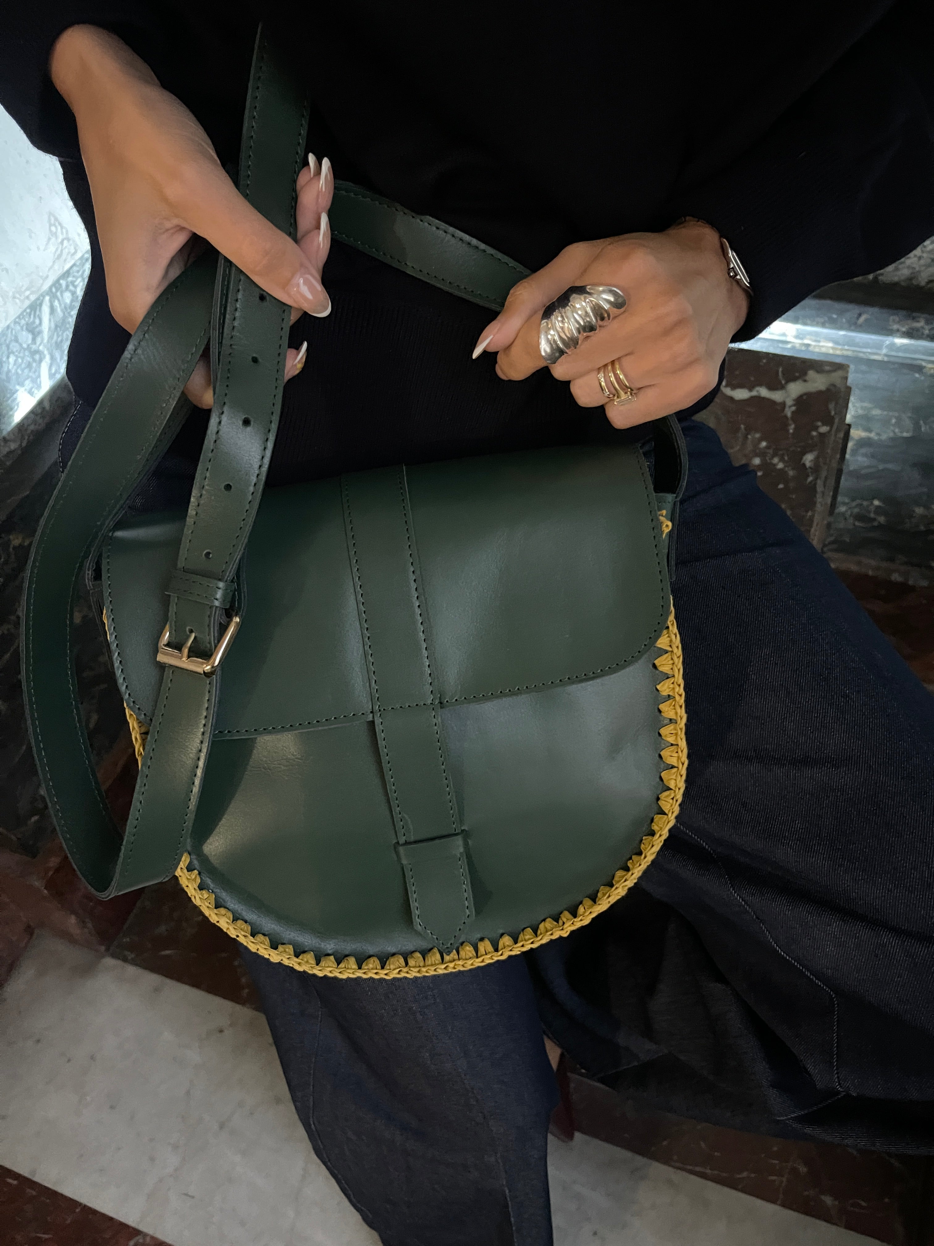 Le sac Elodie kaki en cuir et crochet est l'accessoire parfait pour celles qui recherchent un sac léger, pratique et élégant. Parfait pour compléter vos tenues au quotidien ou pour une sortie décontractée.